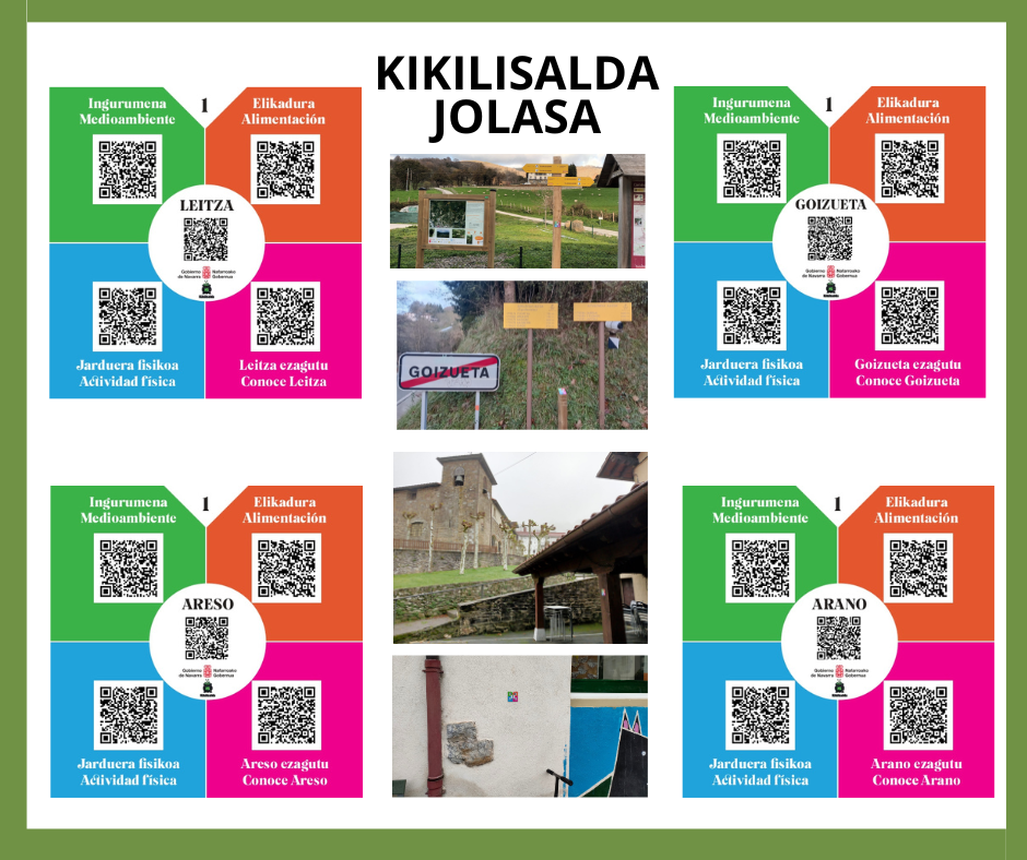 - ● Ibilbidean zehar lau gaien inguruko galdera-erantzunak prestatu ditugu (“Ingurumena”, “Jarduera fisikoa”, “Elikadura” eta “Herria ezagutu”). Bakoitzari kolore bat eman zaio, eta kolore bakoitzean QR bat dago. Ibilbidea kolore bereko galdera-erantzunak osatuz egitean datza jolasak. Koloreen banaketa ondorengoa da: “Ingurumena” (berdea), “Elikadura” (laranja), “Jarduera fisikoa” (urdina) eta “Herria ezagutu” (fuksia).